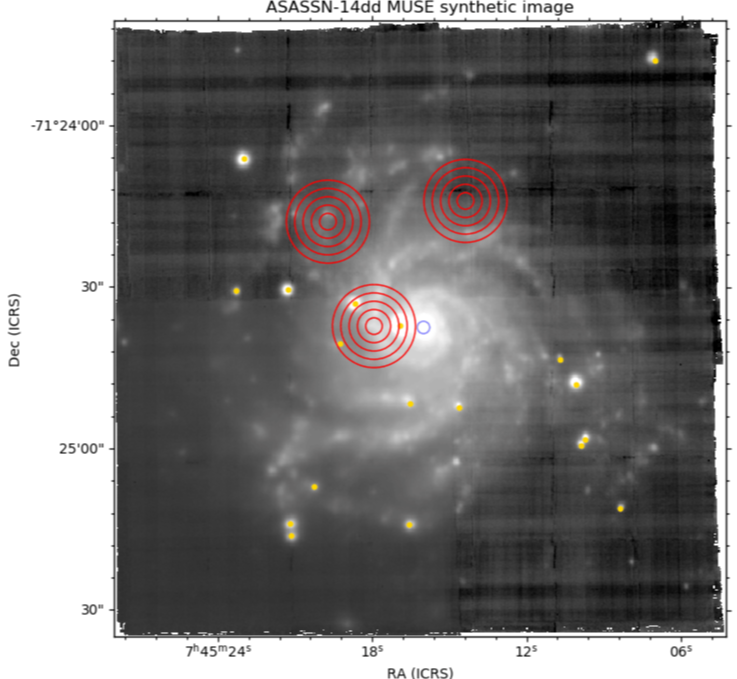 Synthetic r-band image obtained by convoluting the filter transmission with the IFS spectra. Red circles correspond to apertures of 1 to 5 squared kpc centered at SN locations; the blue circle is the galaxy core; yellow dots are objects catalogued in the SDSS catalogue. More info...
